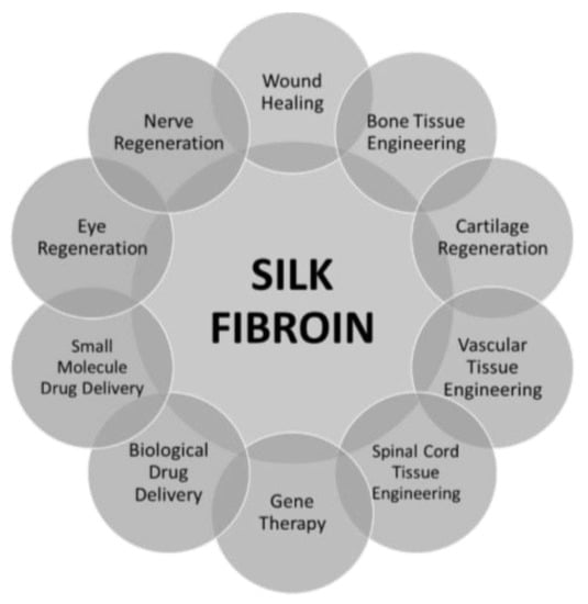 Silk fibroin is used in many fields of biomedicine. It is exploited in bone tissue engineering, eye regeneration, nerve regeneration, skin tissue engineering, cartilage regeneration, vascular tissue engineering, spinal cord tissue engineering, gene therapy, and biological drug delivery [23,50,51] (Figure 3).