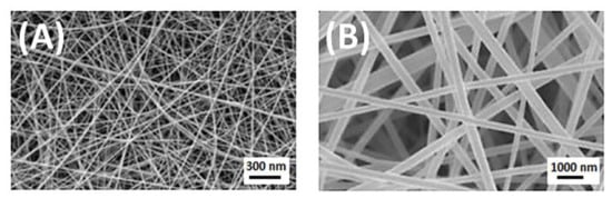 (A) Silk fibroin fiber obtained by spinning method with an average diameter of 65.1 nm; (B) Scanning Electron Microscope (SEM) image of electrospun silk fibroin nanofibers with diameter 400 ± 76 nm. Reprinted from [54] with permission from Elsevier.