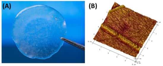 (A) Silk fibroin-based film obtained by casting method and (B) Atomic Force Microscopy (AFM) picture of silk fibroin-based film acquired at fixed resolution (512 × 512 data points) using scan width 5 μm with a scan rate of 1.97 Hz (microscope with a Nanoscope IIIa controller, Digital Instruments, Santa Barbara, CA, USA).