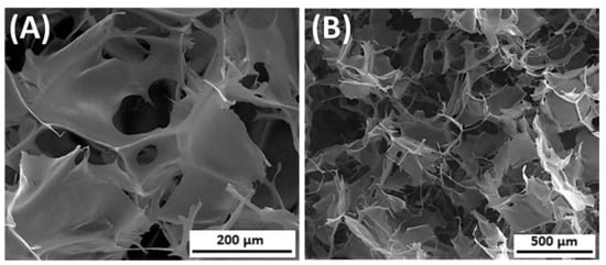 The SEM images of silk fibroin/collagen 3D porous scaffolds, prepared by lyophilization (SF dissolved in 9.3M LiBr), (A) magnification 500×; (B) magnification 150×.