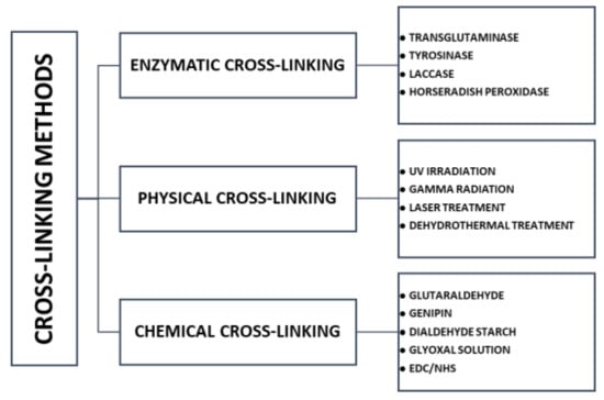 Modification of silk fibroin, by addition of second and third components, was described above. In addition, such mixtures can be subjected to the cross-linking process, to improve several parameters, for example, stability in water conditions and regularity of pores. One component material and non-cross-linked blended material can be characterized by non-elastic and poor stability in an aqueous environment (they swell and then dissolve) [93,94]. After the cross-linking process, biomaterials should not be affected by changes in biodegradability and biocompatibility. From this type of modification, it is expected to improve the mechanical properties of materials, stability in water conditions and to improve degradation resistance [205]. Due to the availability of amine and acid side chains, silk fibroin can be easily modified to suit a wide range of biomedical field applications [34]. Crosslinking is the most common approach to modifying polymeric materials. Three types of cross-linking can be classified: enzymatic, physical, and chemical cross-linking [206,207,208] (Figure 12).
