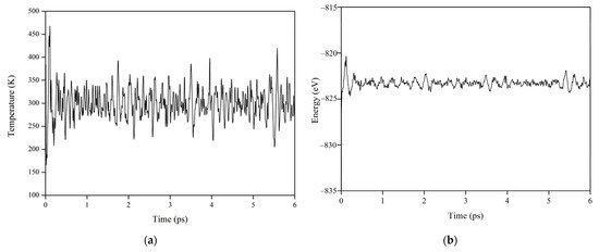 In order to explore the response of La2Zr2O7 to electronic radiation, AIMD simulations are first carried out with an electronic excitation concentration of 0.3%. Figure 2 shows a variation of temperature and total energy with time for La2Zr2O7 with 0.3% electronic excitation at 300 K. It is obvious that the simulation time of 6 ps is long enough so that the system can reach equilibrium states.