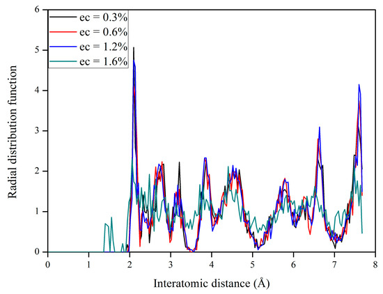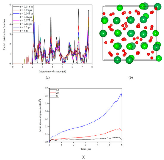 To investigate how the electronic excitation concentration affects microstructural evolution in La2Zr2O7 at 300 K, electronic excitation concentration of 0.3%, 0.6%, 1.2%, and 1.6% are considered. Based on each equilibrium state, the radial distribution function (RDF) analysis is then carried out. Figure 3 shows the RDF for La2Zr2O7 with 0.3%, 0.6%, 1.2%, and 1.6% electronic excitations. For electronic excitations of 0.3%, 0.6%, and 1.2%, it is noted that the structure is ordered at both short-range and long-range distances, meaning that La2Zr2O7 still remains a pyrochlore structure. Here, the short-range correlation means the bonding interaction, and the long-range correlation corresponds to a nonbonding interaction. In the case of 1.6% electronic excitation, the structure retains a short-range order but has lost its long-range order, suggesting that 1.6% electronic excitation can induce a crystalline-to-amorphous transition in La2Zr2O7 at room temperature. In the literature, a similar phenomenon was observed by Sassi et al. [25]. Variation of RDF with time for La2Zr2O7 with 1.6% electronic excitation is displayed in Figure 4a. It is shown that the structural amorphization starts at t = 0.075 ps and the structure is completely amorphized at t = 0.3 ps, i.e., under 1.6% electronic excitation the crystalline-to-amorphous transition occurs very fast.
