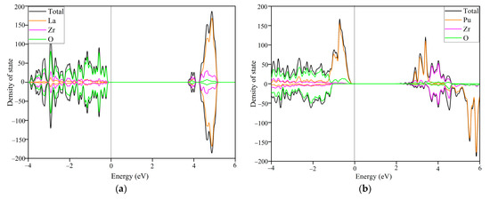 A comparison of the atomic projected density of state (DOS) distribution for ideal (a) La2Zr2O7 and (b) Pu2Zr2O7.