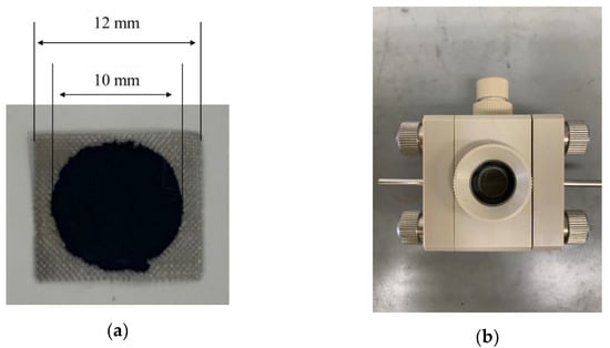 Activated carbon electrodes were prepared for the degradation tests. Steam-activated carbon (surface area is 2004 and total pore volume is 1.24 ) [25] (Hosen Co., Osaka, Japan), Ketjen black (surface area is 1445 and total pore volume is 2.07 ) (EC600JD Ketjen black international Co., Tokyo, Japan), and PTFE (21539-100 Polysciences, Inc., PA, Tokyo, Japan) were mixed in a mass ratio of 8:1:1 to produce the activated carbon electrodes. The mass of each activated carbon electrode was 17.5 mg. The samples were placed in templates, along with nickel meshes as the collecting electrodes, and hot-pressed for 15 minutes at 130 °C and 10 MPa. The final activated carbon electrode was a 10-mm-diameter disc crimped onto a 12-mm square nickel mesh, as shown in Figure 1a.