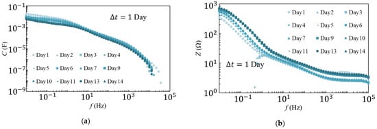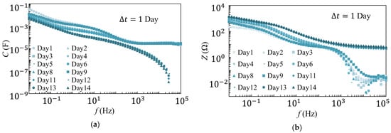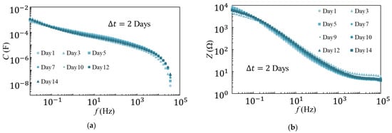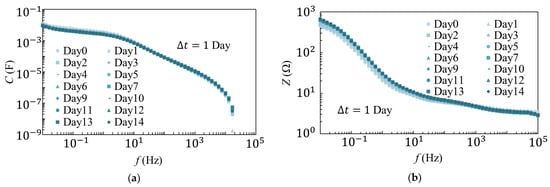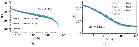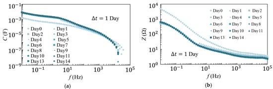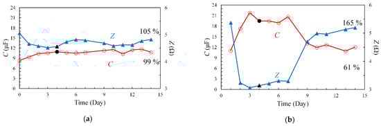 Because voltage dependence of the EDLC was not observed at 1 kHz, the time dependence of Z and C was compared at 1 kHz, and the results are shown in Figure 4. As observed from the measurement results at 25 °C (Figure 4a), C increased and Z decreased until day 5 (black markers); however, the values were approximately constant after day 5.
