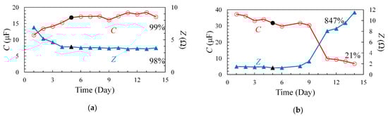 Conversely, as shown in the results of the 80 °C degradation test (Figure 4b), C decreased and Z increased as the number of days increased. Rapid degradation was also observed during days 9–11, wherein C decreased by approximately 20 μF and Z increased by approximately 6 Ω. There are two possible causes for this rapid deterioration: