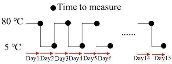 The measurement method used for the variable temperature degradation test is shown in Figure 5. The first measurement was performed one day after the sample was placed at 80 °C. After the first measurement, the temperature was reduced to 5 °C, and the second measurement was made one day later. This process was carried out for two weeks, and the deterioration was observed. The measurement results at 80 °C and 5 °C are shown in Figure 6 and Figure 7, respectively. The results were also compared at 1 kHz, and are shown in Figure 8. The amount of change was minor, as compared to that observed in the degradation test at a constant temperature of 80 °C. Therefore, it is unlikely that the temperature change contributed to the rapid degradation.