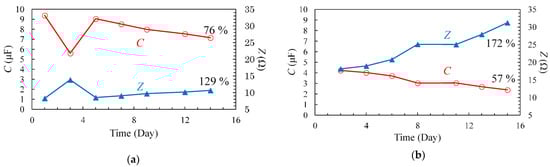 Measurement results of (a) C and (b) Z in the 25 °C degradation tests without discharge.