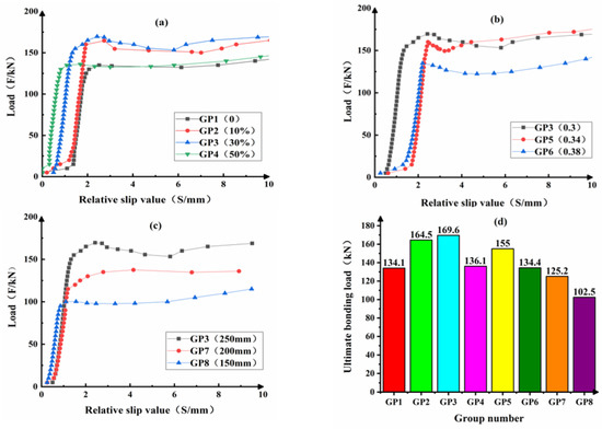 Load-slip curves of CFST (a) different dosage of CFB-BA (b) different W/B (c) different bonding length (d) ultimate bonding load.