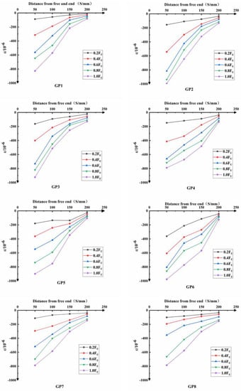 The curve of longitudinal strain distribution of CFST is shown in Figure 7. It can be seen from Figure 7 that at the initial loading process, the longitudinal strain along the height of the steel tube shows no difference under the small load. The force transmission between the steel tube and the concrete in the specimens are relatively uniform. As the load gradually increases, the longitudinal strain along the height of the component also increases. Then, the continuity of the force transmission between the steel tube and the core concrete is gradually broke, which means that the bonding strength between the steel tube and the core concrete is damaged. A relative slip occurs between the steel tube and the core concrete. From the analysis on the strain curve of each specimen, it can be obtained that the largest longitudinal strain on the steel tube appears at its free end, and the smallest strain appears at its loading end.