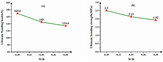 Dependence of W/B on the interface bonding behavior (a) ultimate bonding load (b) ultimate bonding strength.