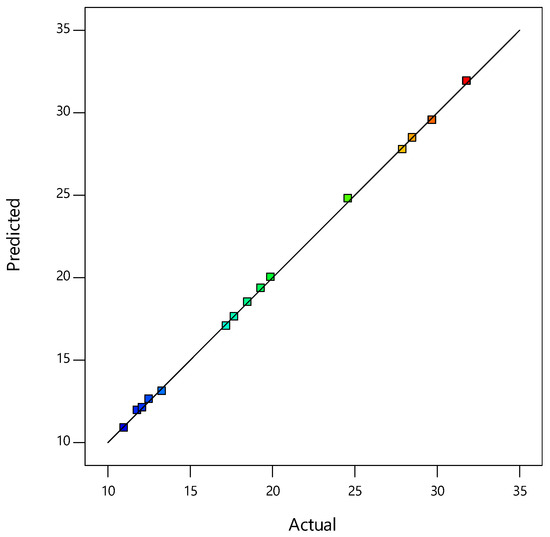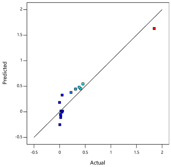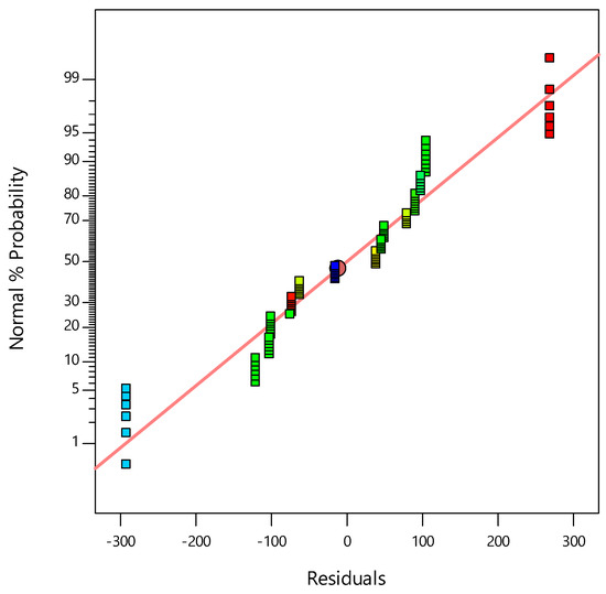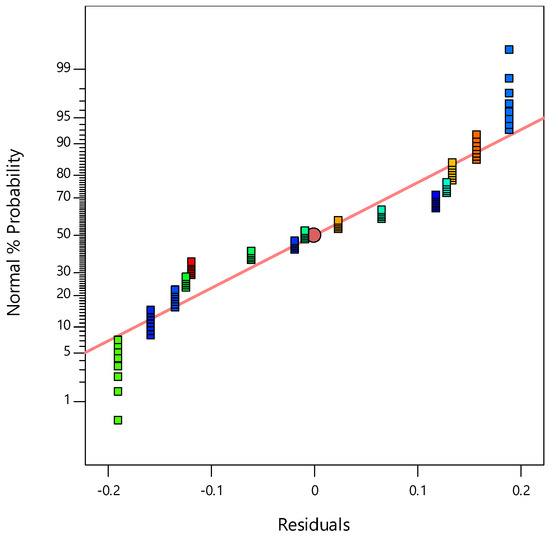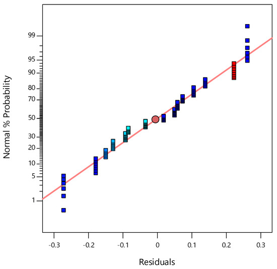 Figure 1 shows that the prediction provided by the model equation vs. the experimental values was a statistically good match. Figure 2 displays the average probability of residuals for a response, confirming whether a normal distribution follows the standard deviations between the actual and predicted response values [33,34].