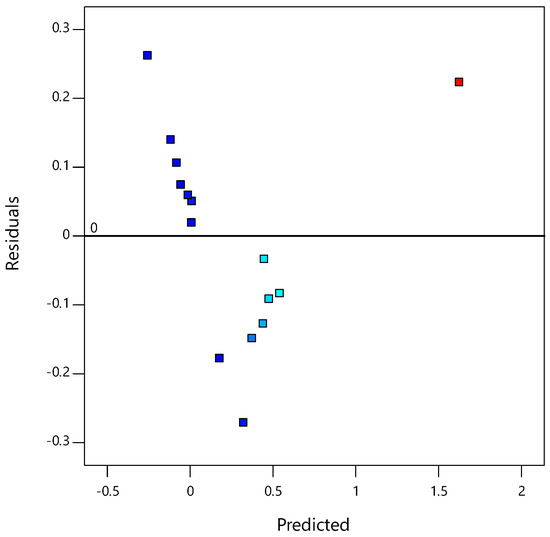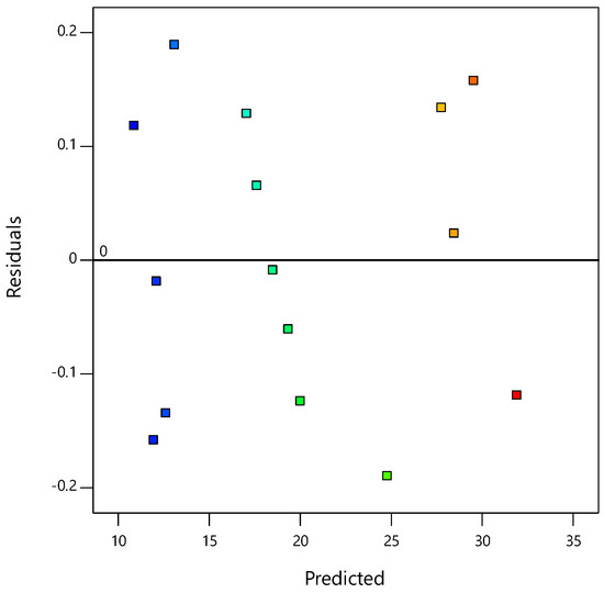 Figure 3 plots the residuals against the predicted response, whereby the constant variance assumption can be verified. All points of the experimental runs were randomly distributed. All values were within the −0.2 to 0.2 range, suggesting that the models proposed by the RSM were satisfactory and confirm the constant variance assumptions.