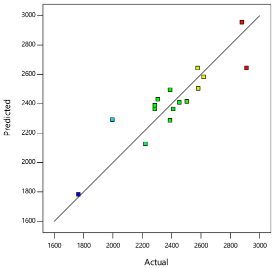 As mentioned earlier, in Table S2, the A, C, AB, AC, BC, C2 p-values less than 0.0500 and the model f value of 50.36 indicate that the model terms were significant. The Pred R2 of 0.7881 was in reasonable agreement with the Adj R2 of 0.8088 (i.e., the difference was less than 0.2). An Adequate precision ratio of 30.037 indicated an adequate signal. The Pred R2 of the model was 0.7881 (Table S2). The model adequacy was checked by correlating the observed and predicted data. Figure 5 shows that the model equation prediction experimental values for the UCS were a statistically good match.