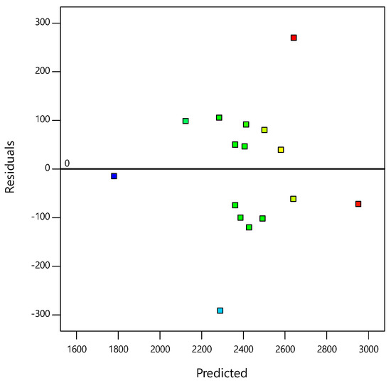 The residual plotted against the predicted response verified the constant variance assumption for CBR values as seen from Figure 7. All points of the experimental runs were randomly distributed. All values lay mostly within the range of −150 and 150. These results suggest that the models proposed by the RSM were satisfactory and that the constant variance assumptions were confirmed.
