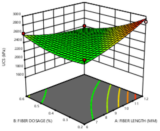 Table 7 presents the UCS values obtained by the experiments performed in the lab and measured from the FCCCD experiments designed using Design-Expert software. The following models (Equation (2)) were developed for the UCS values using the regression coefficient in Table S2.