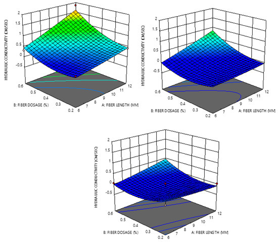In this study response surface methodology analysis was employed to better understand the improvement in geotechnical properties such as unconfined compression strength, California bearing ratio, and hydraulic conductivity. The effect of fiber length and fiber dosage, along with curing time, in the presence of lime has been critically evaluated. The developed RSM model consists of full quadratic and backward analyses for predicting the optimum potential values of the input variables for the FD (0.2, 0.4, and 0.6% by soil dry weight), FL (6, 9, and 12 mm), and CT for the CBR, UCS, and HC. ANOVA was performed to determine the statistical significance of the RSM model and better understand the effects of the significant parameters (i.e., FL, FD, CT, FL*FD, FL*CT, FD*CT, FL2, FD2, and CT2) on the response variables of targeted geotechnical properties (i.e., the CBR, UCS, and HC). Curing periods of up to 14 days were considered for the CBR; 60–360 days for the UCS; and 7–28 days for HC, and these were used as performance indicators. The following conclusions can be drawn from the study.