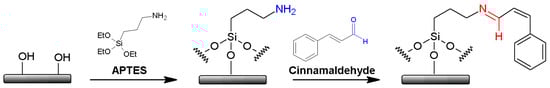 In this context, oxide particles and films can support the pH-controlled release of CIN. This study presents a simple CIN-grafting procedure based on imine chemistry and on alkylsilane linkers. Oxides can be easily functionalized with alkylsilanes in order to modify their surface properties [40,41]. Here, (3-aminopropyl)triethoxysilane (APTES) was adopted for the surface functionalization of the oxide surface; the terminal amine group of the silane (-NH2) could then be used for a condensation reaction with the aldehydic group of CIN (-HC=O), yielding an imine bond (-HC=N-) between APTES and CIN (Figure 1). The imine bond is known to be sensitive to the pH of the environment, and its hydrolysis is catalyzed at low pH values. Release tests were thus carried out between pH 5.0 and 7.4, thus within a range that includes the characteristic values of numerous types of food [34,35,36,42,43,44,45].
