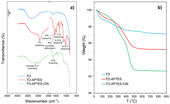 (a) FTIR spectra and (b) TG analyses of TO, TO-APTES, and TO-APTES-CIN.