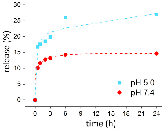 In recent years, research has focused on the possibility to catalyze the release of active molecules through environmental stimuli, such as the matrix pH. The ability to increase the release of CIN by lowering the pH is of great interest to the food and cosmetic industry. Several types of food are characterized by pH values slightly lower than neutrality, such as fresh milk (pH 6.8) [34], black tea (pH 6.7) [35], and vegetables like zucchini (pH 6.5) [36]. On the other hand, it is well known that the growth of several fungi and molds is favored by more acidic pH values [37,38], and that the food spoilage of products involves an initial acidification step [34,39]. For instance, milk is known to acidify until pH values around 5.0 when it ages due to the formation of lactic acid [34].
