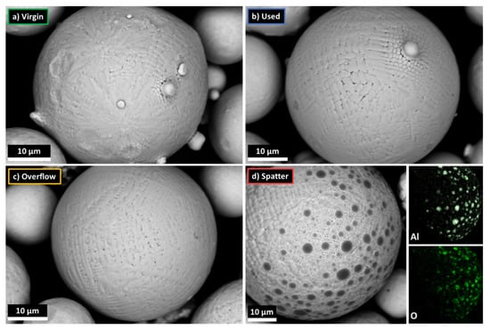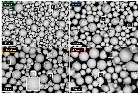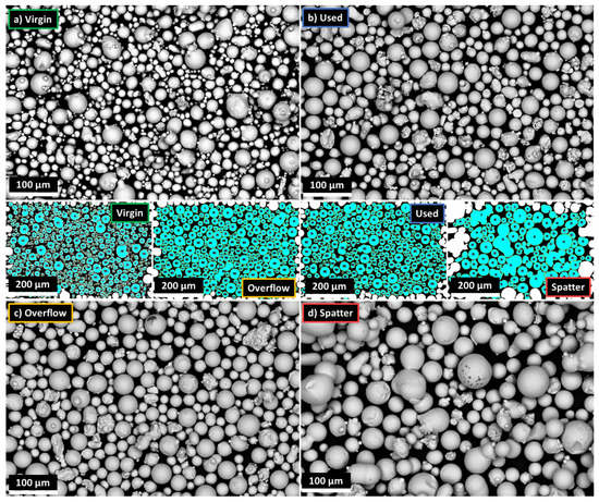 Each of the powders contains a large common part, i.e., particles that have not changed morphologically because they have not been melted or distorted during the LPBF process. It should be remembered that it is the same powder in different states. From a PSD point of view, overflow powder morphology allows for its reuse. The used industrial powder screening device is set to be fast. This causes a large amount of overflow powder to be collected, and in the case of this study, it is ≈5–10% of the initial powder batch, which is treated as waste. In terms of morphology, it is almost the same powder as the reconditioned and ready-to-use used powder.