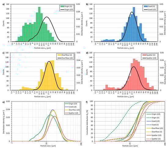 Figure 3a–d presents the comparison of the density distribution of q2.LD(xm) obtained from laser diffraction with the histograms of q2.IA(xm) from the SEM image analysis for each powder state separately. Figure 3e presents a comparison of the density distribution of q2.LD(xm) for all the powder states, and Figure 3f shows both the 1-Q2.LD(xi) and 1-Q2.IA(xi) plots. With the virgin powder, the shift between the image analysis and the diffraction is very large.