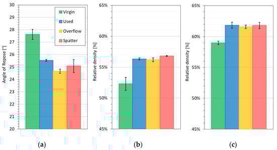 Parameters of the static flow properties of the powders with regard to the sample series (V, U, O, S): (a) Graph of the angle of repose (°); (b,c) Comparison of the bulk density and compacted density of the powders expressed as the % density of the IN718 alloy (8.19 g/cm3).