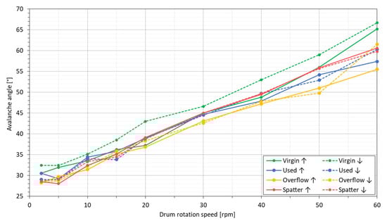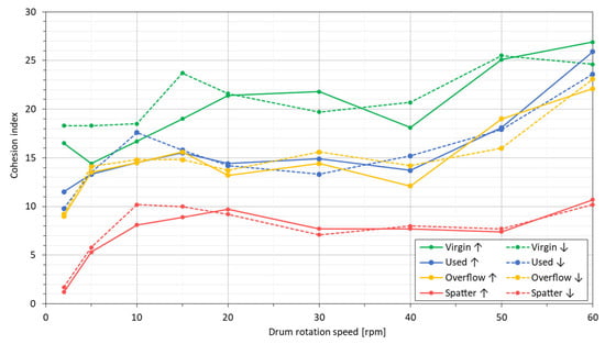 According to review paper [10], bulk density and tap density cannot be directly compared with the density of the layer applied during the LPBF process, as these powders’ characteristics do not reflect the dynamic interactions between powder particles during the application of layers in the powder bed processes. Therefore, it is becoming more and more popular to analyze powders in terms of flowability with novel methods, such as measuring the cohesion index and avalanche angles with the use of rotating drum analyzers. In Figure 5, an avalanche angle (αA), as a function of drum ration speed for all the investigated powders, is shown. The solid lines show the results for an increasing drum rotation speed (↑), and the dashed lines show the results for a decreasing drum rotation speed (↓). The avalanche angle increases almost linearly for all of the powders. Only the virgin powder shows a slight difference at a decreasing rotation speed.