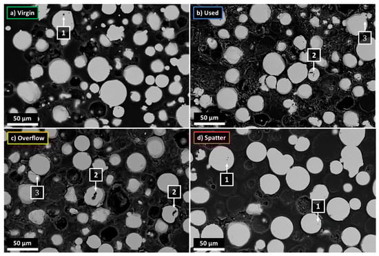 - All the powders contain some proportion of non-spherical particles with a highly developed surface. They are most often single particles or groups of particles connected by solidified material (2). They could arise as defects during the gas atomization process (2) due to the collision of already formed particles with non-solidified or partially solidified material [33]. The number of such particles, as shown by microscopic images, increases with the successive cycles of using the powder. Such particles can also be formed in the LPBF process as a type of spatter, in this case by collisions between metallic jet spatter and solid spatter [25].