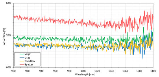 Analysis of the laser absorption of the powders was performed using the Exemplar Plus Spectrophotometer (model BTC655N-ST1) and BIP2.0 Integrating Sphere equipped with a 20W Tungsten Light Source (B&W Tek, Newark, DE, USA). The system allows measurements of the laser absorption of materials with the possibility of modulating monochromatic light in the range of 900–1100 nm.