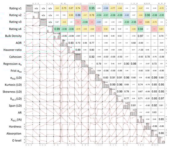 For the purpose of the experiment, it was assumed that within a given combination of properties, the relationship between the individual results and powder usability rating, as well as between individual properties, is characterized by a linear correlation. The most representative properties of the Inconel 718 powder in all states, obtained during the studies, are summarized in Table 12. Based on Table 12, Pearson’s linear correlation coefficient R was determined for all the combinations of properties. A scatter-plot matrix, to better represent correlations, is shown in Figure 11.