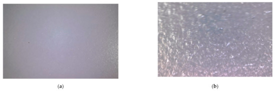 Microscopic image of polyurethane foil: (a) under a magnification of 50×; (b) under a magnification of 200×.