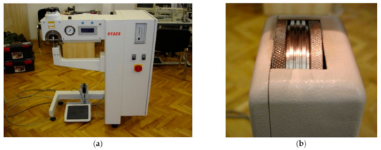 For the preparation of polyurethane material with ultrasonic joints and PICs, an ultrasonic joining machine was used. The machine for ultrasonic joining (Figure 2) had a lower engraving counter-roll, 8 mm wide (the joint was in the form of three lines of the same width). The distance between the lower engraving counter and the sonotrode was set to 0.28 mm. Additionally, the speed of welding was set to 3 m·min−1, and the welding energy was 285 W.