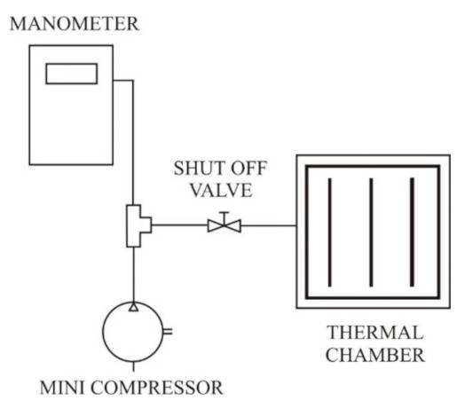 Adequate measuring equipment was designed for inflating air into the PICs (Figure 3). It consisted of a mini compressor, a manometer with a pressure sensor, a shut-off valve, and the PIC. The mini compressor inflated air into the PIC. When appropriate pressure was reached within the PIC, the mini compressor stopped inflating air. The shut-off valve prevented the exit of air from the PIC.
