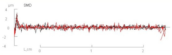 As can be seen from Table 2, the compressional energy of polyurethane material was 0.046 N·m−1, with a coefficient of variation of 13.5%. Its compressional resilience was 81.02%, with a coefficient of variation of 11.13%. The coefficient of friction (MIU) and surface roughness (SMD) describe the material’s friction properties and surface contour. The measured value of the coefficient of friction was 1.064, while the value of surface roughness was 0.221 µm.