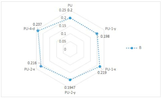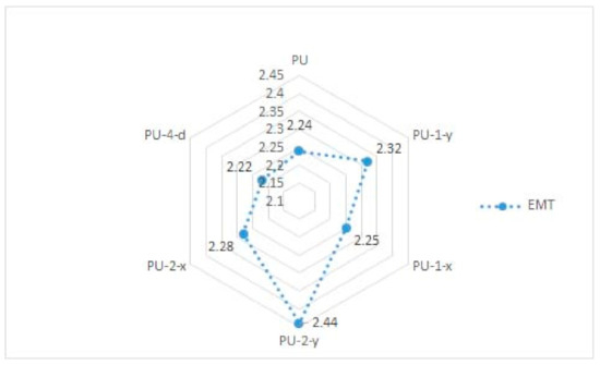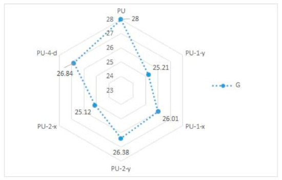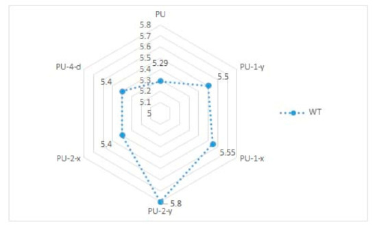 The tensile energy of the six polyurethane materials was in the range of 5.3–5.8 N·m−1 (Figure 7). As can be seen, the polyurethane material with two joints in the y-direction (i.e., sample designated as PU-2-y) had the highest value of tensile energy. The values of the tensile energy of the remaining materials were quite similar. The increase in tensile energy for materials with joints, in comparison to the polyurethane material without ultrasonic joints, was 2–8%. Figure 8 presents the results of the tested extension of polyurethane materials. As can be seen from the figure, the extension of materials was in the range of 2.2–2.45%. Among the tested polyurethane materials, the highest extension was again characteristic of the material with two joints in the y-direction (sample PU-2-y). Among the materials with one ultrasonic joint, the material with a joint in the y-direction exhibited higher extension (sample PU-1-y). This brought us to the conclusion that ultrasonic joints in the y-direction increased the overall extension of the designed polyurethane material. According to the obtained results, there were small differences between the values of bending stiffness of ultrasonically joint polyurethane materials (Figure 9). This can be explained by the change in thickness of polyurethane material in the area of the joint. Another reason for such behavior is a change in the structure of the material at the joint point, which prevented the material from slipping. The results of the shear stiffness (Figure 10) show that the polyurethane material with an ultrasonic joint had lower shear stiffness in comparison to the material without a joint. The reason was the rigidity of the ultrasonic joint, which prevented the shear of polyurethane material.
