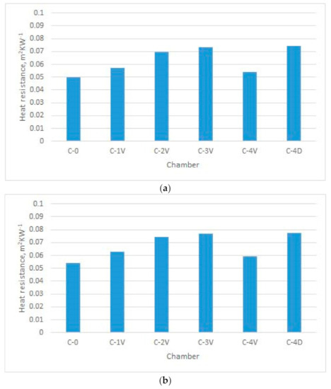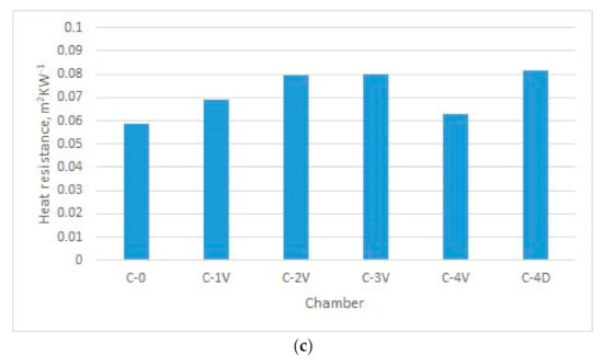 It is interesting to note the changes in the heat resistance of PICs after air was blown into the chambers. Accordingly, the results shown in Figure 12 indicate that the heat resistance of the PIC without an ultrasonic joint (chamber C-0), which in the noninflated state had the lowest value, changed significantly. Already at a pressure of 20 mbar, the heat resistance of PIC C-0 became highest among the tested PICs (0.1531 m2·K·W−1). The reason for this significant change in the heat resistance of PIC C-0 was the different construction of the PIC. Specifically, the mentioned PIC was the only one among the six tested PICs that did not have an ultrasonic joint. In this PIC, even at a pressure of 20 mbar, a larger amount of air was blown due to the joints that, in other PICs, prevented the chamber from inflating. In this way, a smaller amount of air could be inflated into the chambers.