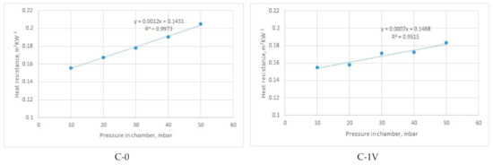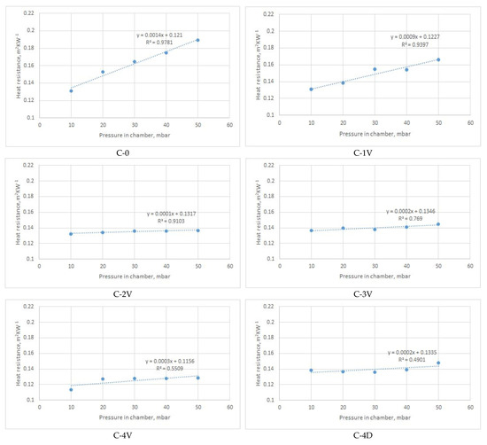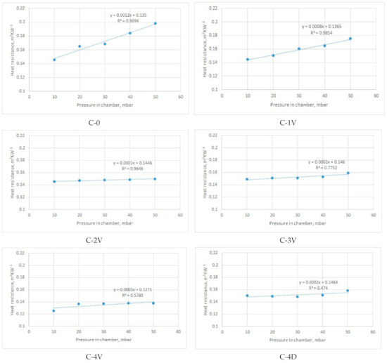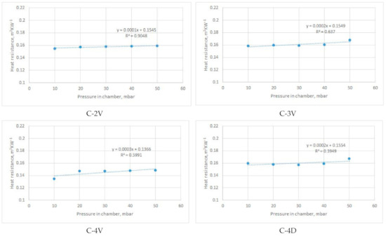 Figure 12, Figure 13and Figure 14 give the linear regression equation and coefficients of determination describing the proportion of variance in the heat resistance that is predic from the pressure in the chamber. As can be seen from the figures, high values of the coefficient were characteristic for PICs C-0, C-1V, and C-2V at all three ambient temperatures (20 °C, 15 °C, and 10 °C). According to the results, the remaining PICs exhibited moderate to weak correlation (the weakest one was for PIC C-4D at all temperatures).