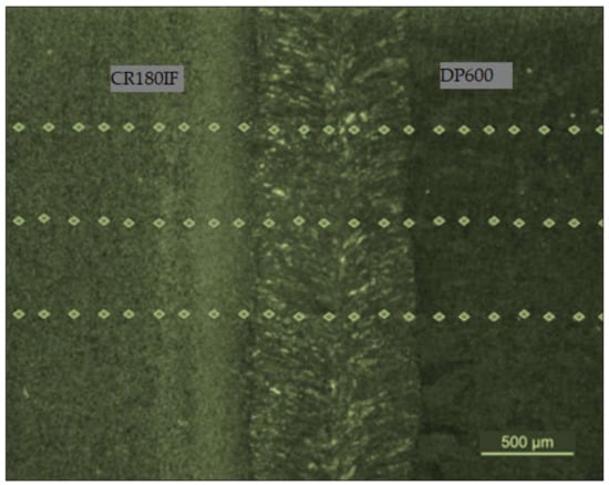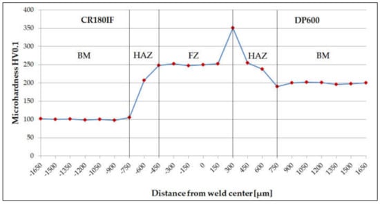 In the described case, the hardness reached the highest value on the side of the DP600 material, which also had a higher . A similar finding is described in [], where authors claim that fusion zone hardness increases with richer chemistries producing higher values.