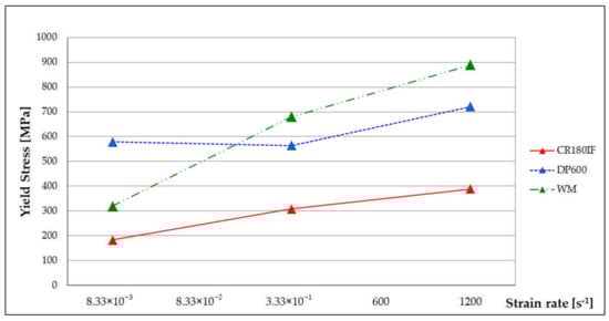 - The yield strength of CR180IF steel increased from 186 MPa in static conditions to 389 MPa in dynamic conditions (109%). The yield strength of DP600 steel increased from 393 MPa in static conditions to 721 MPa in dynamic conditions (83%). The yield strength of laser-welded material increased from 319 MPa in static conditions to 889 MPa in dynamic conditions (178%);