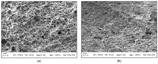 The fracture surface of CR180IF steel under static loading conditions is in Figure 9. Figure 9a,b shows the fracture surface under static (8.33 × 10−3 s−1) and dynamic loading conditions (1200 s−1), respectively. Ductile failure with pitting morphology predominated in both fractures. After dynamic stress, the holes were smaller. As seen in Figure 9b. The dimples diminished with increasing strain rate, forming voids with the increased depth and reduced size. The consequence of this was a larger number of small voids at a strain rate of 1200 s−1. The fracture surface of DP600 steel under static loading is presented in Figure 10a. It indicates ductile failure. The fracture surface under dynamic conditions was formed by a pit morphology caused by transcrystalline ductile failure in Figure 10b.