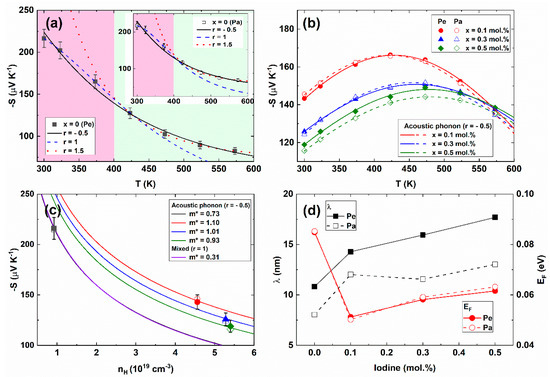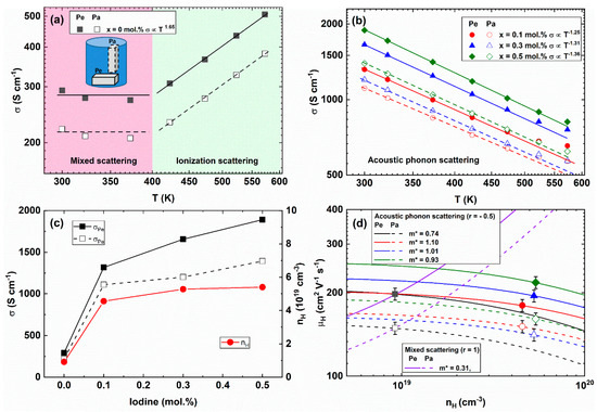 - Shuai, J.; Mao, J.; Song, S.; Zhu, Q.; Sun, J.; Wang, Y.; He, R.; Zhou, J.; Chen, G.; Singh, D.J.; et al. Tuning the Carrier Scattering Mechanism to Effectively Improve the Thermoelectric Properties. Energy Environ. Sci. 2017, 10, 799–807. [Google Scholar] [CrossRef]