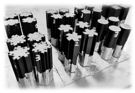 The ABS stay-in-place formworks were 3D printed in upright positions in groups of four. The nozzle used for 3D printing was characterized by the diameter of 0.8 mm. Two layers of filament were needed to create each formwork wall. The average printing speed of 30 mm/s was utilized to maintain the integrity of printed slender formworks and the best possible quality of the print. Altogether, 28 formworks were 3D printed. The formworks were sealed by a duct-tape from the bottom and filled with the fresh cement mortar mix from the top. In Figure 2, 3D printed formworks just after filling with the fresh cement mortar mix are presented. The formworks were covered from top by glass sheets and left for 28 days for curing in temperature of +20 ± 1 °C. Before the tests, the duct-tape from the bottom parts of specimens was removed.