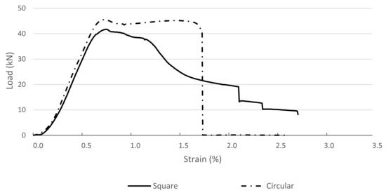 Load–strain relations for the tested columns of square and circular cross-sections.