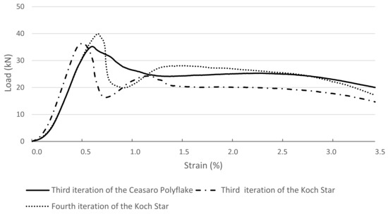 Load–strain relations for the tested columns with the cross-section in the shape of the third iteration of the Ceasaro Polyflake, third and fourth iteration of the Koch Star.