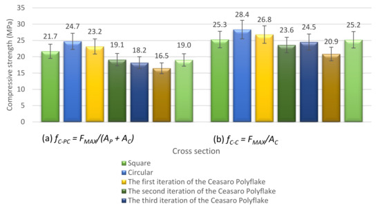 Both variants of calculated compressive strength are presented in Figure 7. One can notice that taking into account the area of plastic is especially important in case of fractal-based cross-sections. The area of plastic is the largest in these cases and can influence the calculated compressive strength by up to 6.3 MPa.