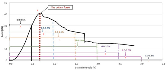 Due to the non-conventional behavior of the tested columns with 3D printed plastic formwork (playing also the role of reinforcement), their compressive strength is not a sufficient parameter to capture their mechanical characteristics. Taking into account the shape of the achieved load–strain relations (which resemble relations achieved while testing fiber-reinforced concretes), the authors decided to use methods similar to those adopted in the technology of fiber-reinforced concretes [26]. For all tested specimens, the energy needed for their ultimate destruction was calculated. Namely, the area under the load–strain curve was computed in seven intervals associated with achieved strain (every 0.5%). The additional value of energy was calculated for the maximum load regardless at what value of strain it was reached. The graphic scheme of how the energy was calculated is presented in Figure 8.