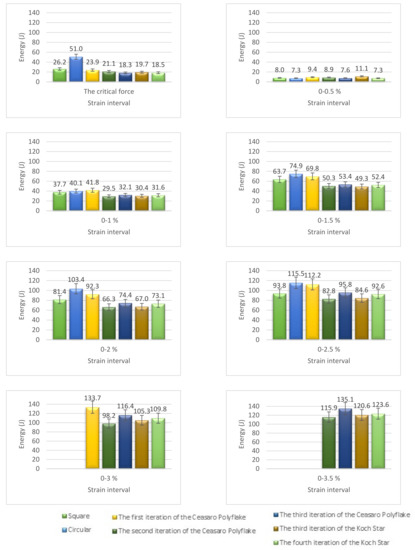 The energy needed to achieve particular strains of tested concrete–plastic columns is presented in Figure 9. Up to the strain of 2.5%, it was possible to register the energy for all tested specimens. For strains over 2.5%, the specimens with traditional (square and circular) cross-sections were destroyed; thus, the energy is not registered. Specimens with cross-sections that can be created using traditional formwork techniques but would be very labor intensive to create (1st and 2nd iteration of the Ceasaro Polyflake) are able to sustain a bit larger strains than specimens with square and circular cross-sections. In case of specimens with cross-sections that are impossible to be created with the help of traditional formwork techniques, the maximum value of strain planned to be realized was achieved, while specimens were still carrying significant load (50 ± 5% of the maximum load). The highest value of the registered energy was equal to 133.7 J and achieved by the column with the cross-section of the 1st iteration of Ceasaro Polyflake. This value is closely followed by energy values achieved by the 3rd and 4th iteration of Koch Star characterized by 120.6 J and 123.6 J, respectively, but registered at higher strains. From the traditional structural point of view, the most interesting are the values of energy needed to reach the maximum load. The circular cross-section proved to be the best solution at this stance with almost two times larger energy needed in comparison to the square cross-section and achieving the highest loading force and subsequently compressive strength.