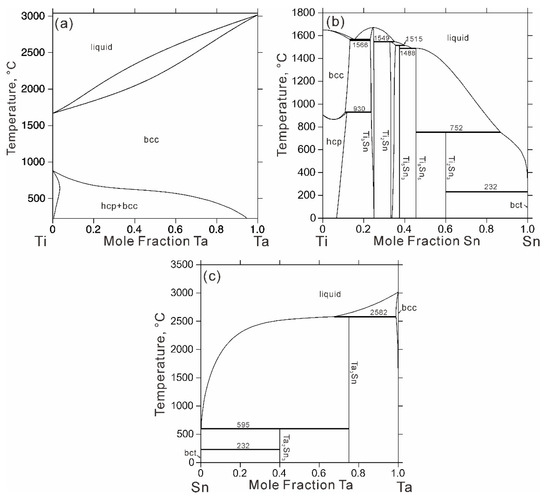 Calculated binary phase diagrams: (a) Ti-Ta data from Ref. [12], (b) Ti-Sn data from Ref. [13] and (c) Ta-Sn data from Ref. [14].